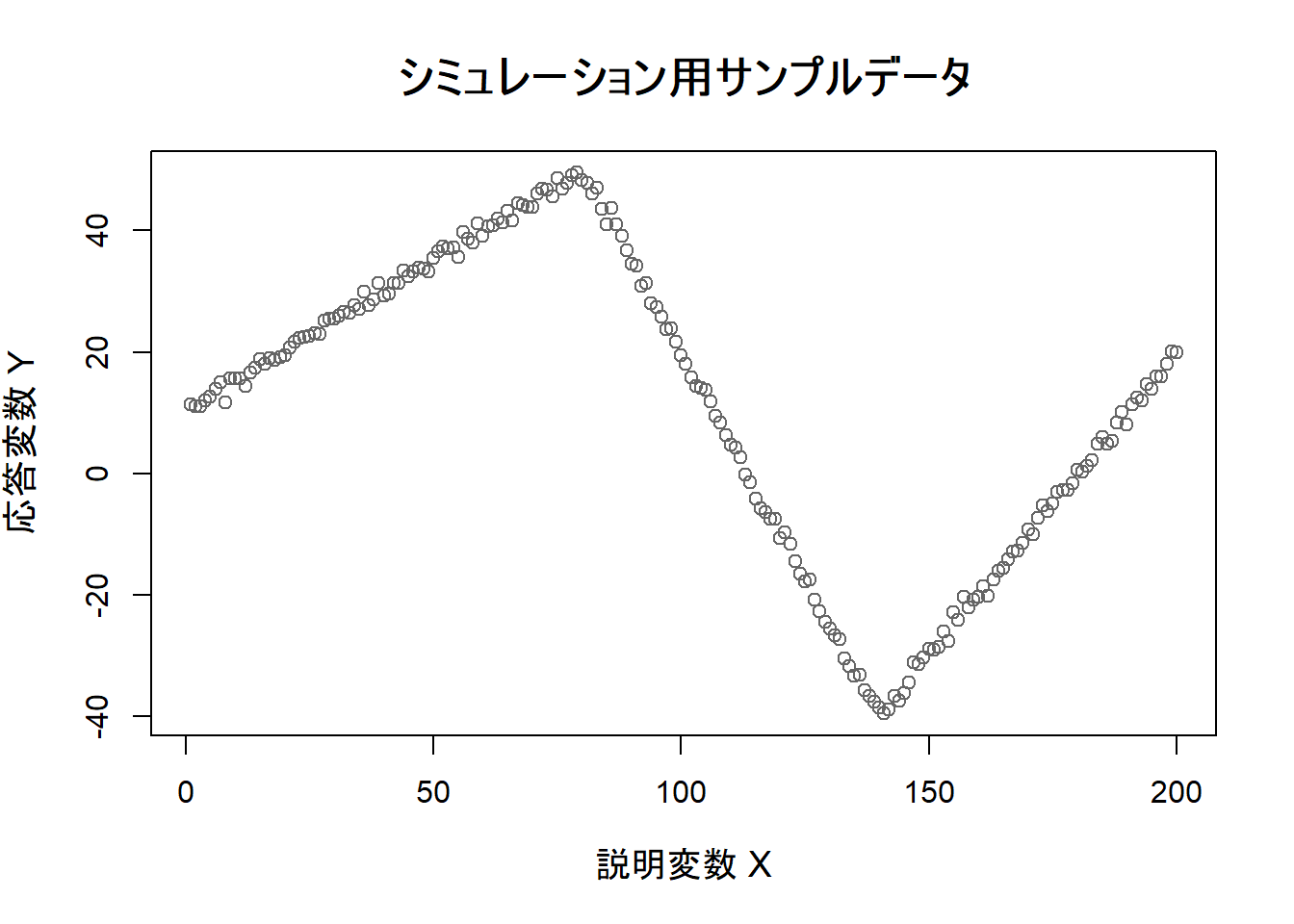 xが80付近と140付近で、データの傾きが変化していることを見て取れます。