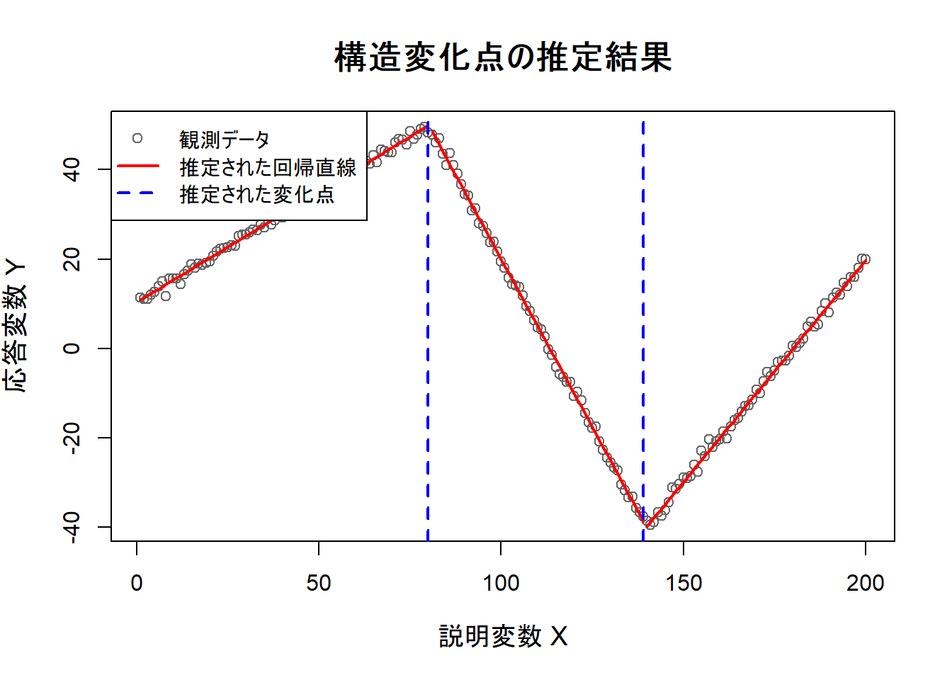 legend = c("観測データ", "推定された回帰直線", "推定された変化点"),