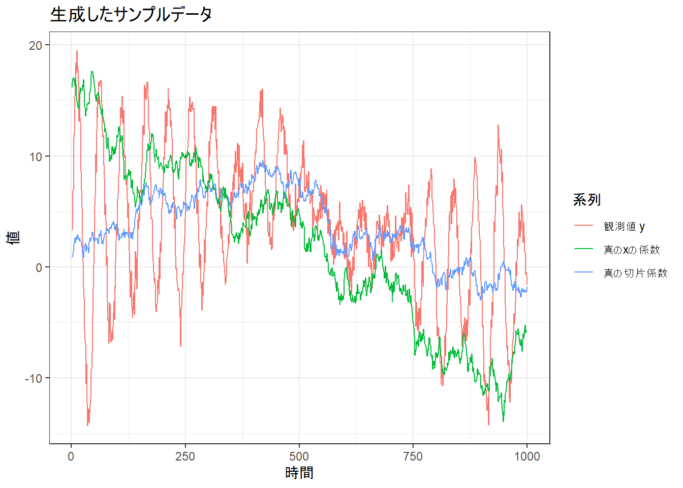 まず、シミュレーションのためのサンプルデータを作成します。ここでは、時間と共に変動する切片項と、1つの説明変数の係数を持つモデルを考えます。
