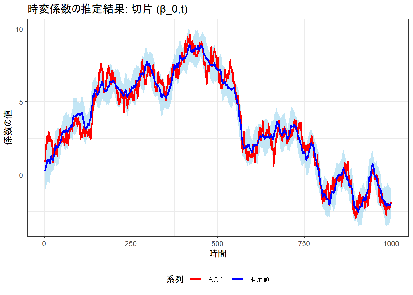 • 切片係数: 推定された切片係数は、真の係数の動きに追従しています。信頼区間も真の値をほぼカバーしています。