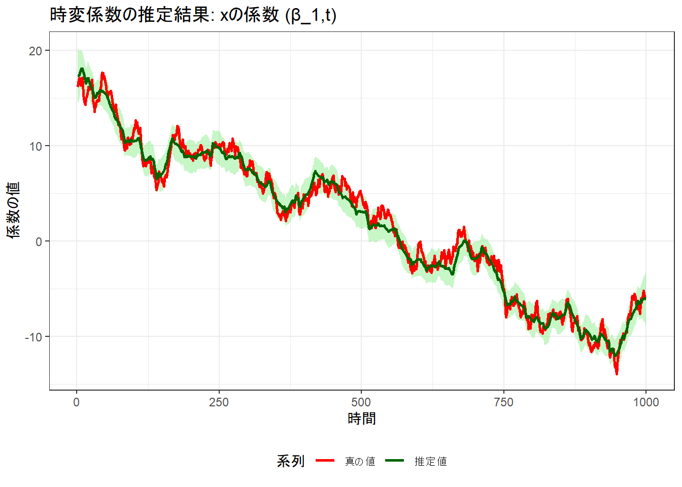• xの係数: 同様に、説明変数xの係数についても、推定値は真の係数の変動パターンを捉えています。