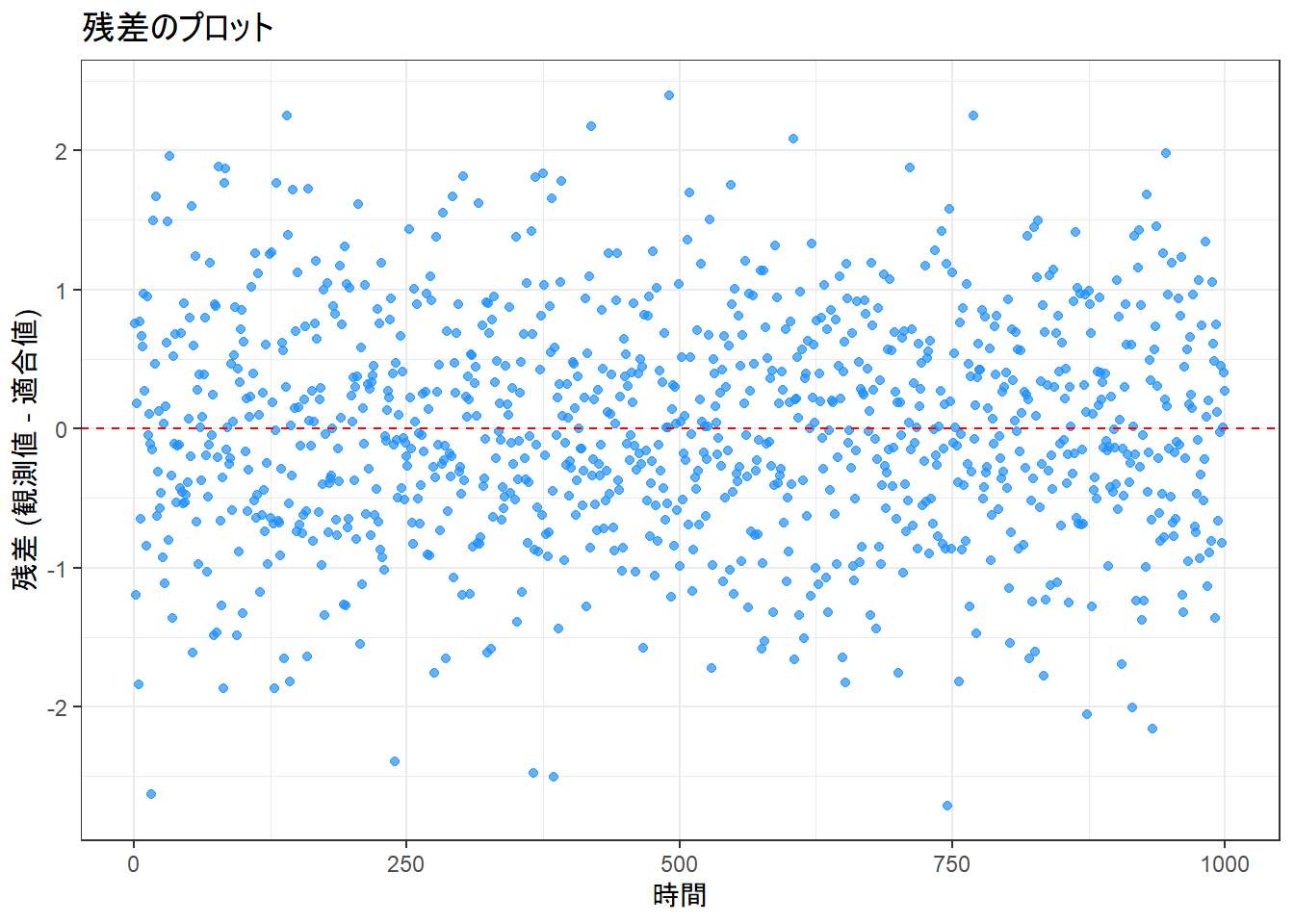 • このプロットでは、残差が特定の傾向(例えば、時間と共に増加/減少する、周期的なパターンを持つなど)を持たず、赤い破線で示された0の周りでランダムに分布しているように見えます。
