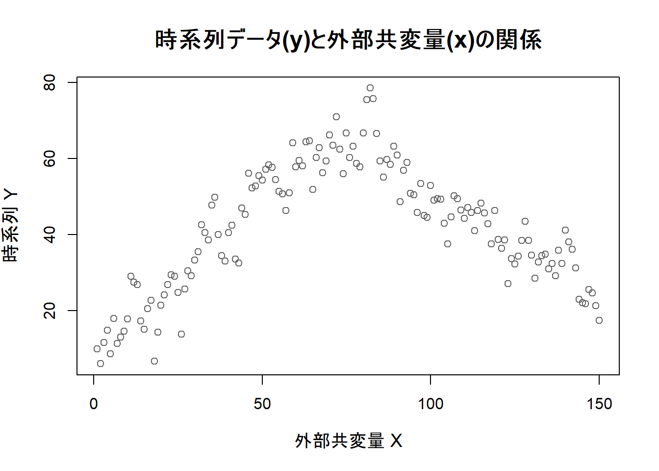 main = "時系列データ(y)と外部共変量(x)の関係",