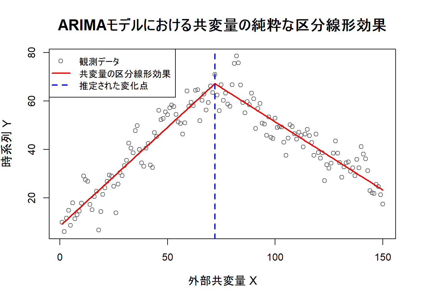 legend = c("観測データ", "共変量の区分線形効果", "推定された変化点"),