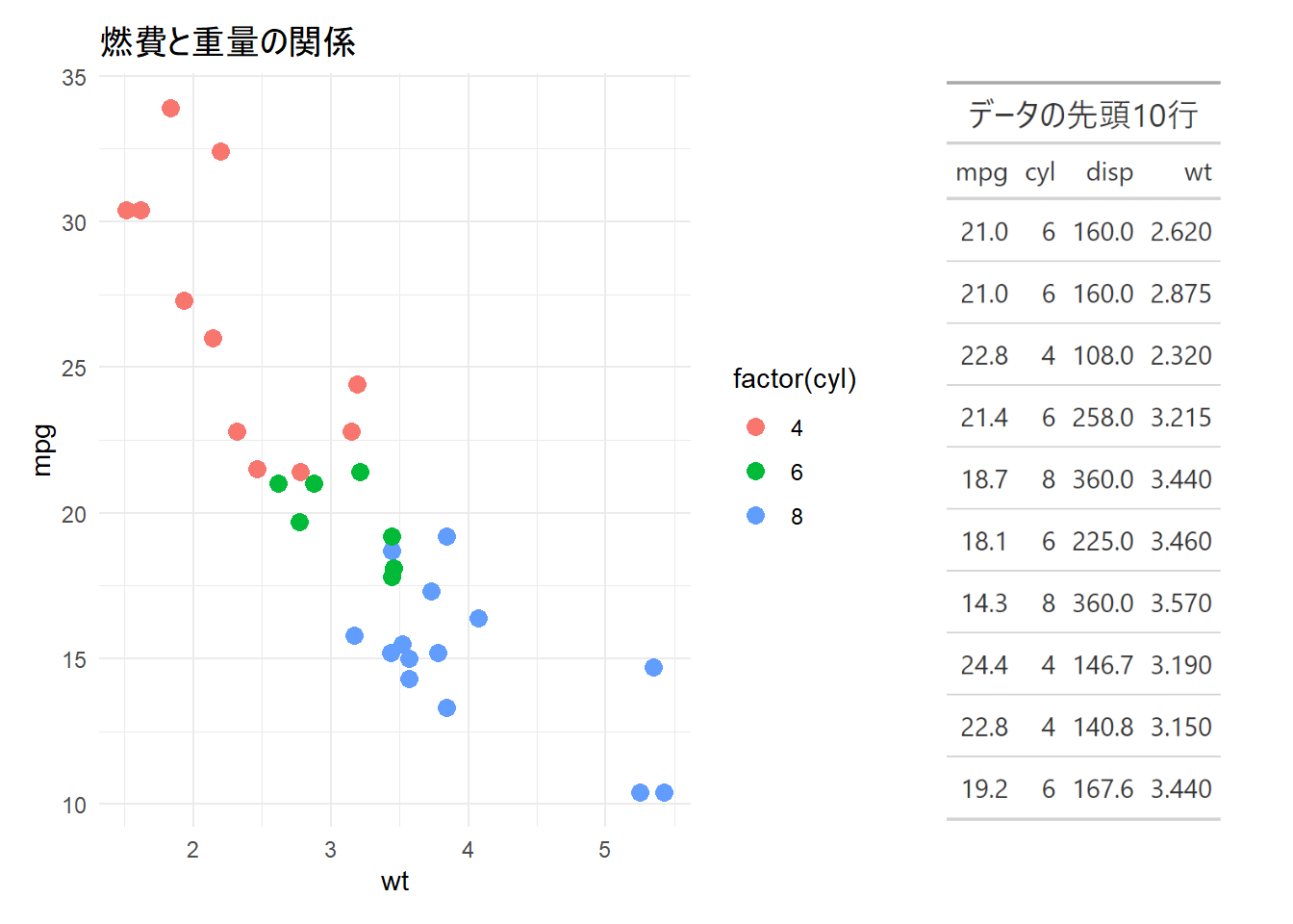 ggplot {ggplot2}を利用して作成したチャートと、gt {gt}を利用して作成したテーブルを1枚の画像にまとめる方法を確認します。