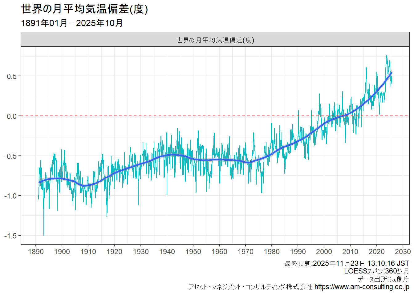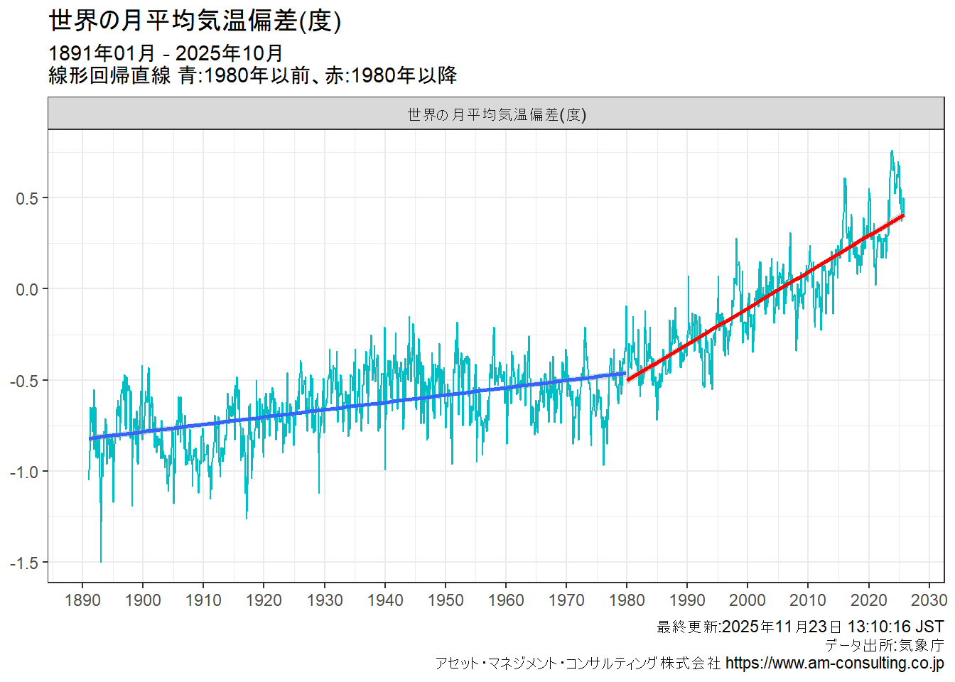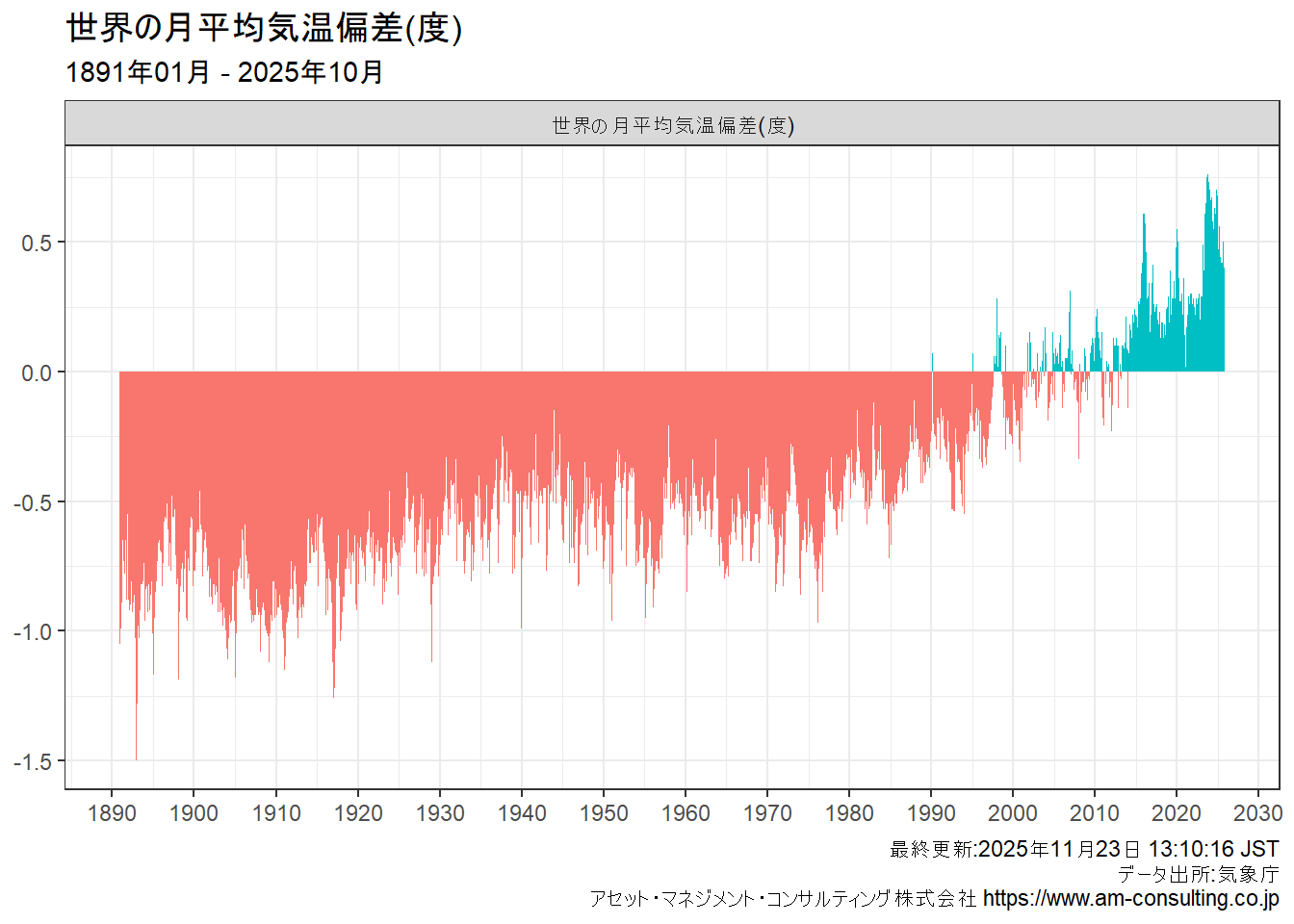 気象庁が公表しております世界の月平均気温偏差について、時系列推移を確認します。
