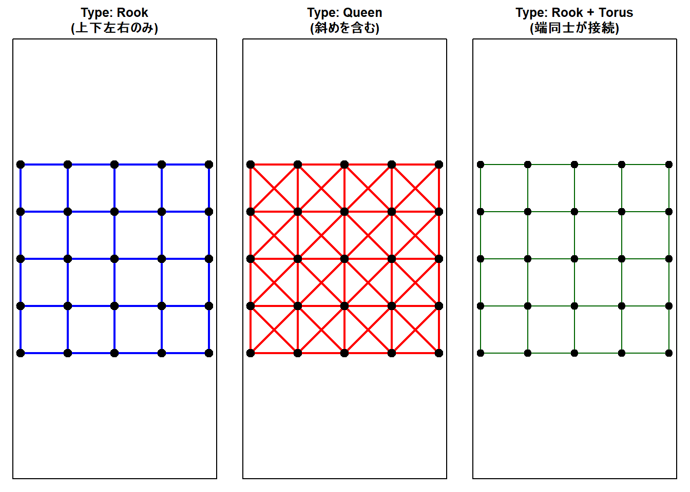 Average number of links: 4 3種類の近傍定義(Rook, Queen, Torus)によって、空間的なつながりの強さ(リンク数)がどのように変化するかを定量的に確認できます。