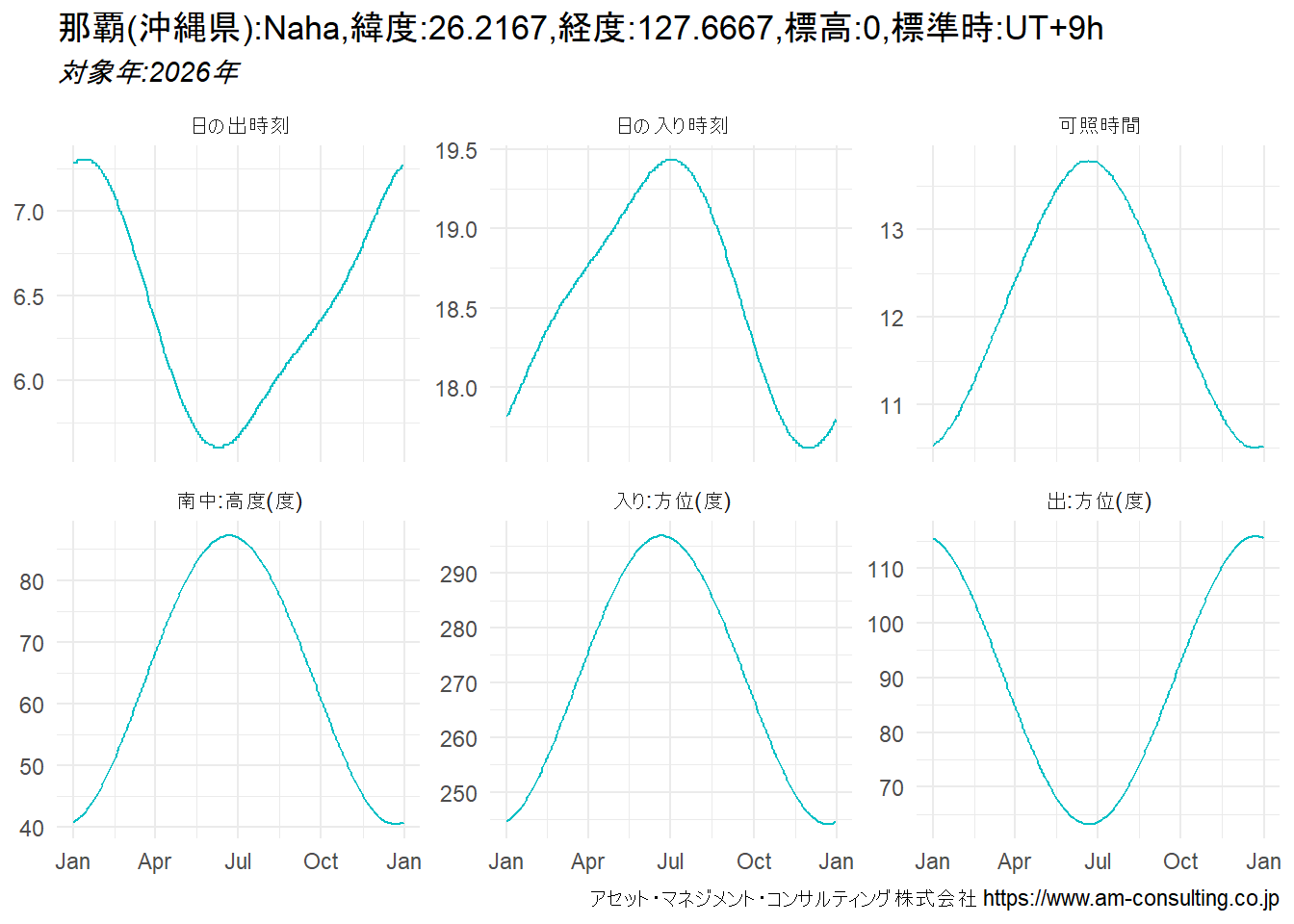 以下は対象地点の位置図と札幌(北海道)東京(東京都)福岡(福岡県)および那覇(沖縄県)の日の出入り時刻ほかの時系列チャートです。