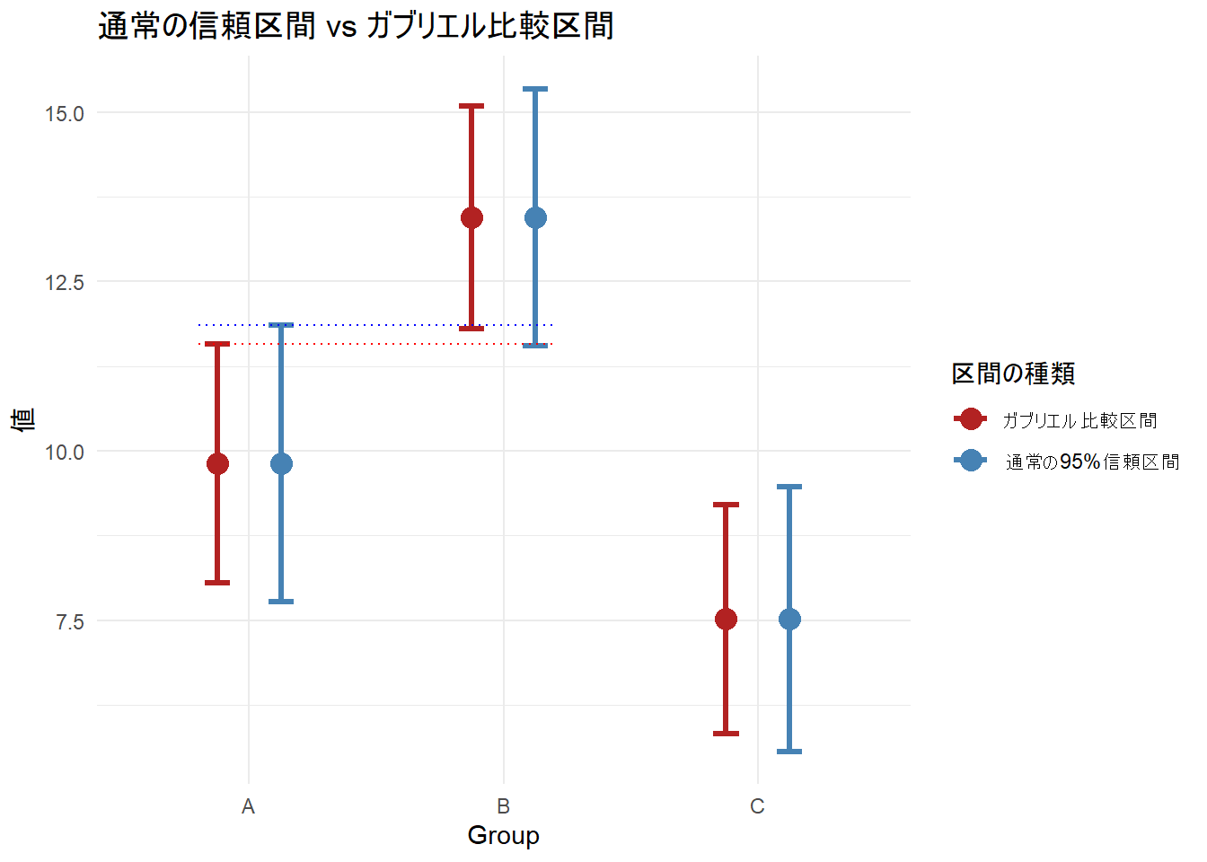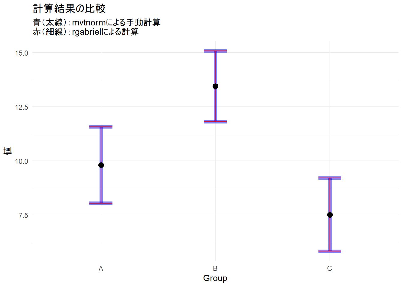 3 C 5.57 9.47 5.83 9.21Figure 1 の『グループAの上限』と『グループBの下限』を確認しますと、通常の信頼区間(青)では Aの上限 > Bの下限 となっており、バーが重なっていますが、ガブリエル区間(赤)では Aの上限 < Bの下限 となっており、隙間があるため、『バーが重ならない=有意差あり』と視覚的に正しく判定することができます。