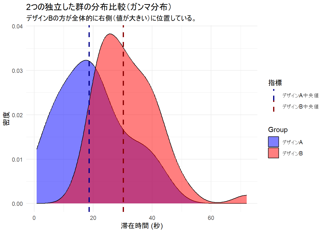 # シナリオ: 2つの異なるウェブサイトデザイン(A案、B案)における滞在時間の比較