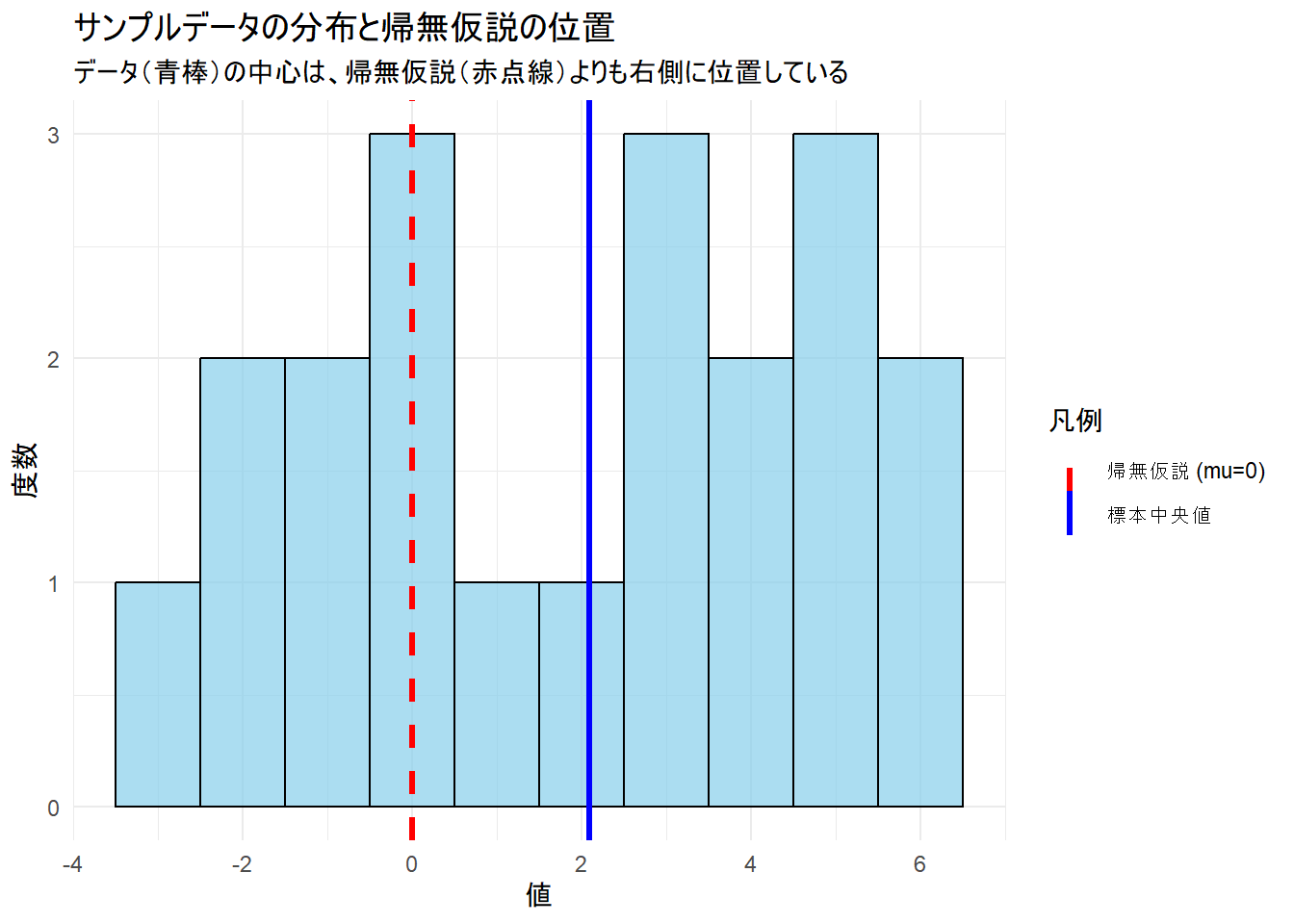 subtitle = "データ(青棒)の中心は、帰無仮説(赤点線)よりも右側に位置している",