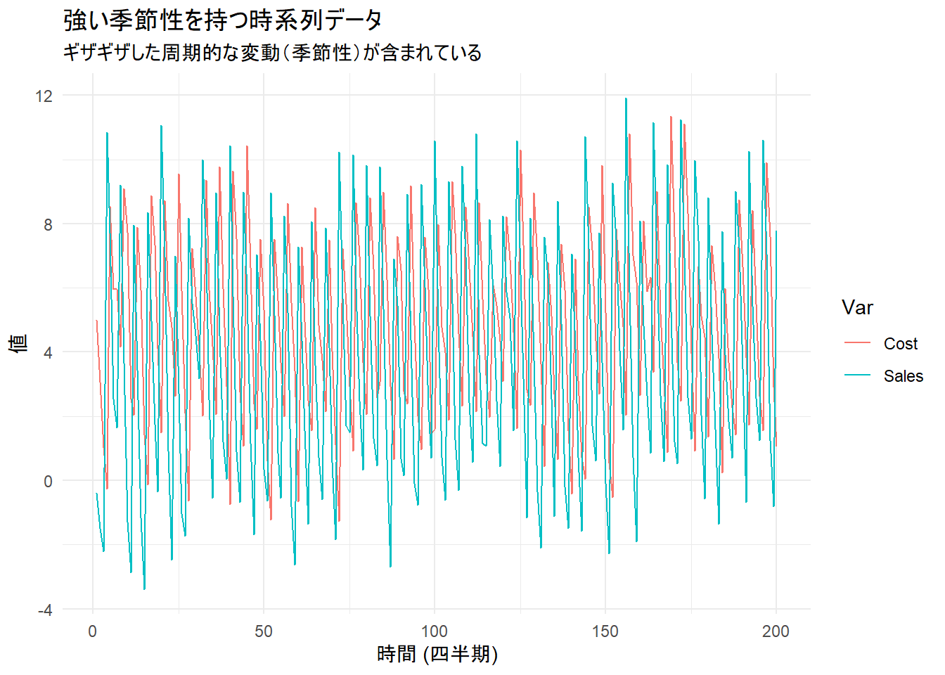 x = "時間 (四半期)", y = "値"