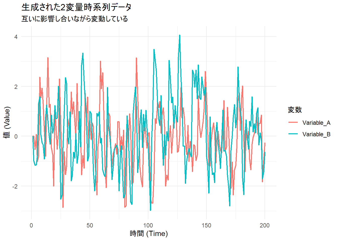 Variable_B = -0.4 * A(t-1) + 0.6 * B(t-1) + eVARモデルの推定