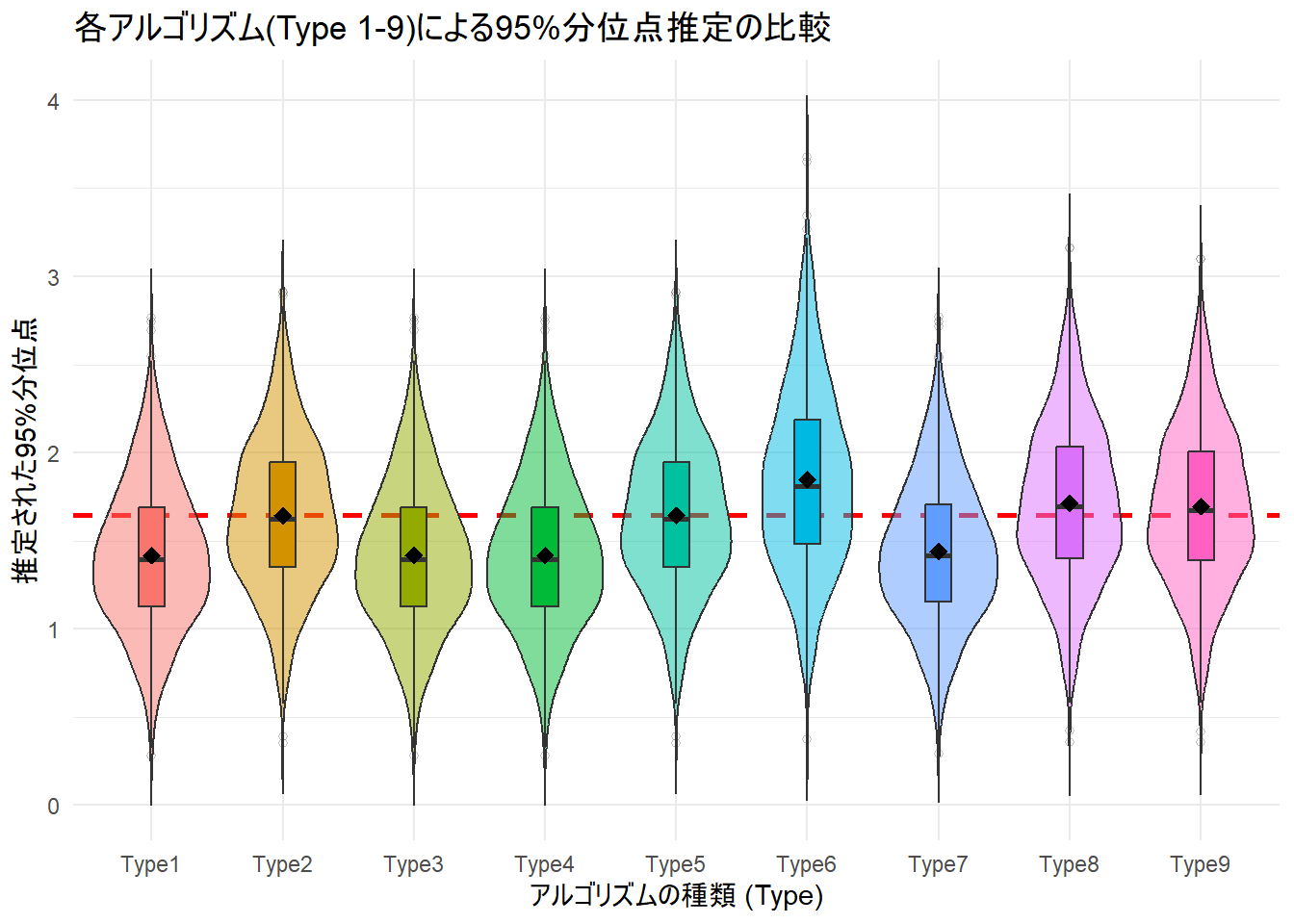 title = "各アルゴリズム(Type 1-9)による95%分位点推定の比較",
