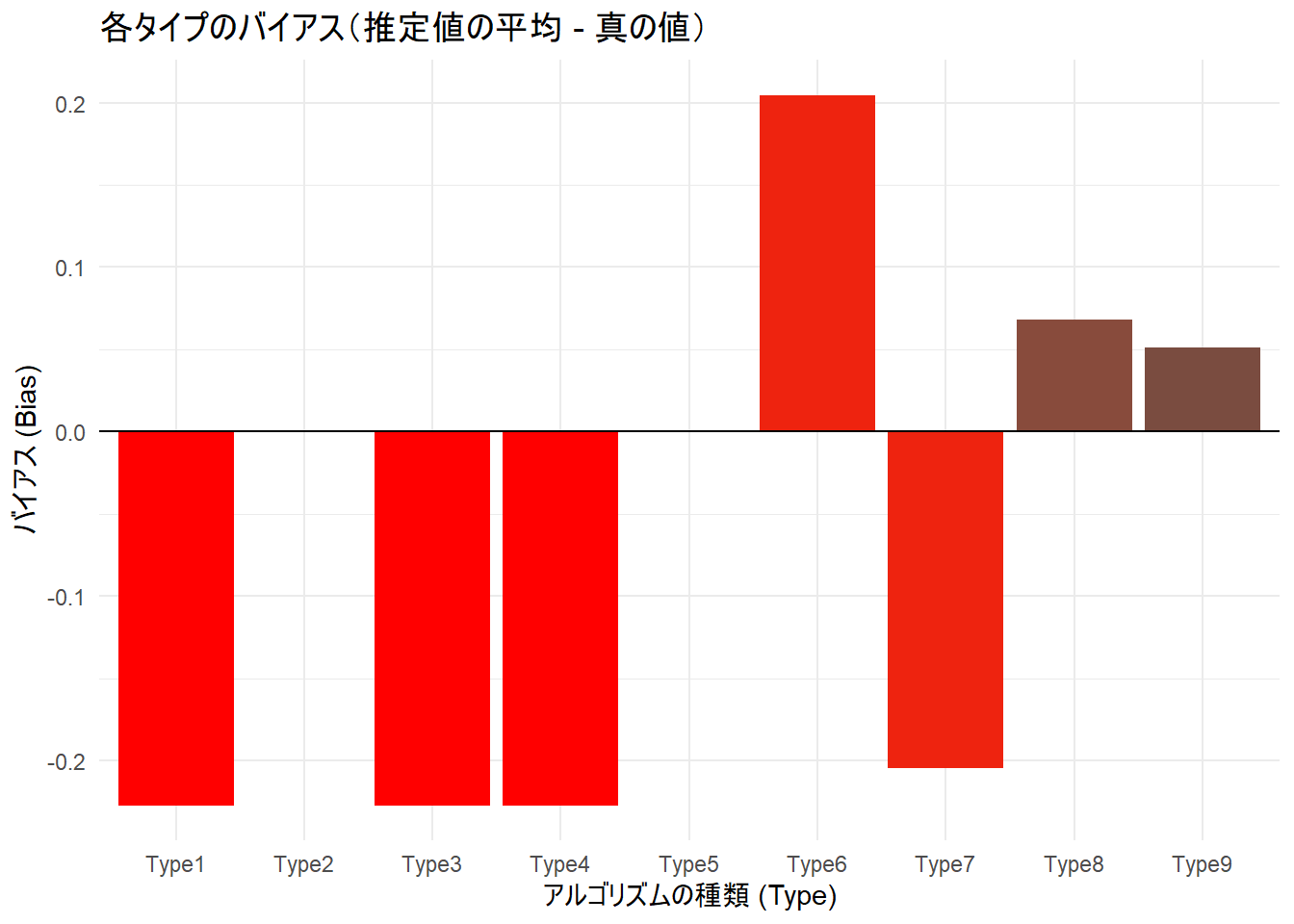 title = "各タイプのバイアス(推定値の平均 - 真の値)",