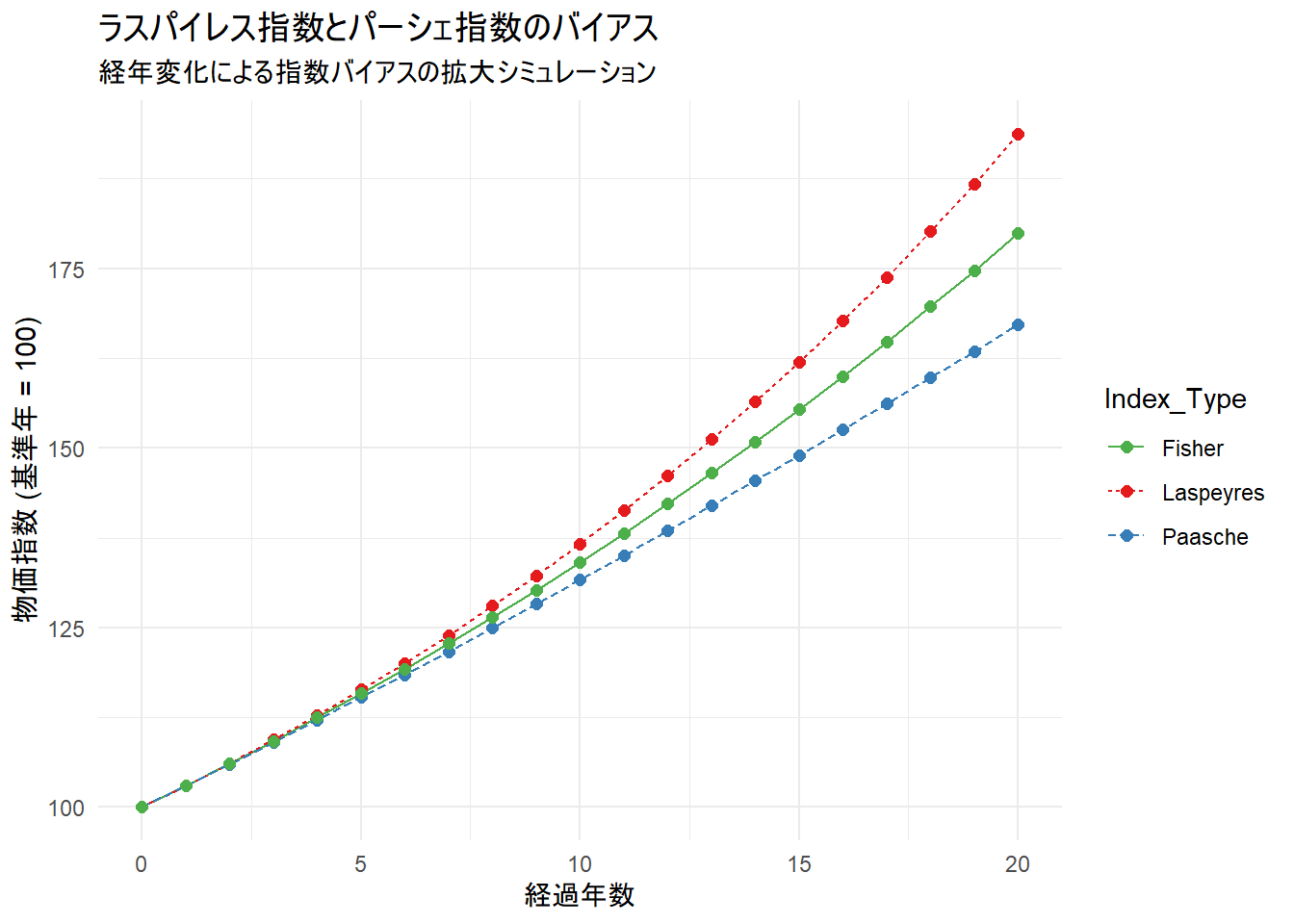 Figure 1 から、緑色の線(フィッシャー指数=理想指数)に対して、赤い線(ラスパイレス指数)が上振れし、青い線(パーシェ指数)が下振れして、年が経つにつれてその差(バイアス)が広がっていく様子が確認できます。